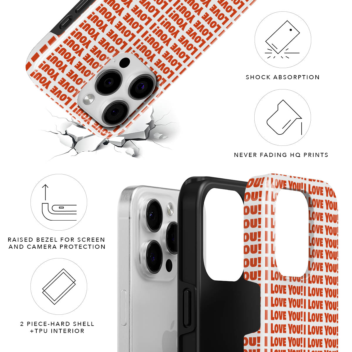 Tutte le nostre custodie hanno un bordo rialzato intorno alla fotocamera, per cui la fotocamera del telefono non tocca le superfici piatte quando il telefono è appoggiato sul retro.
