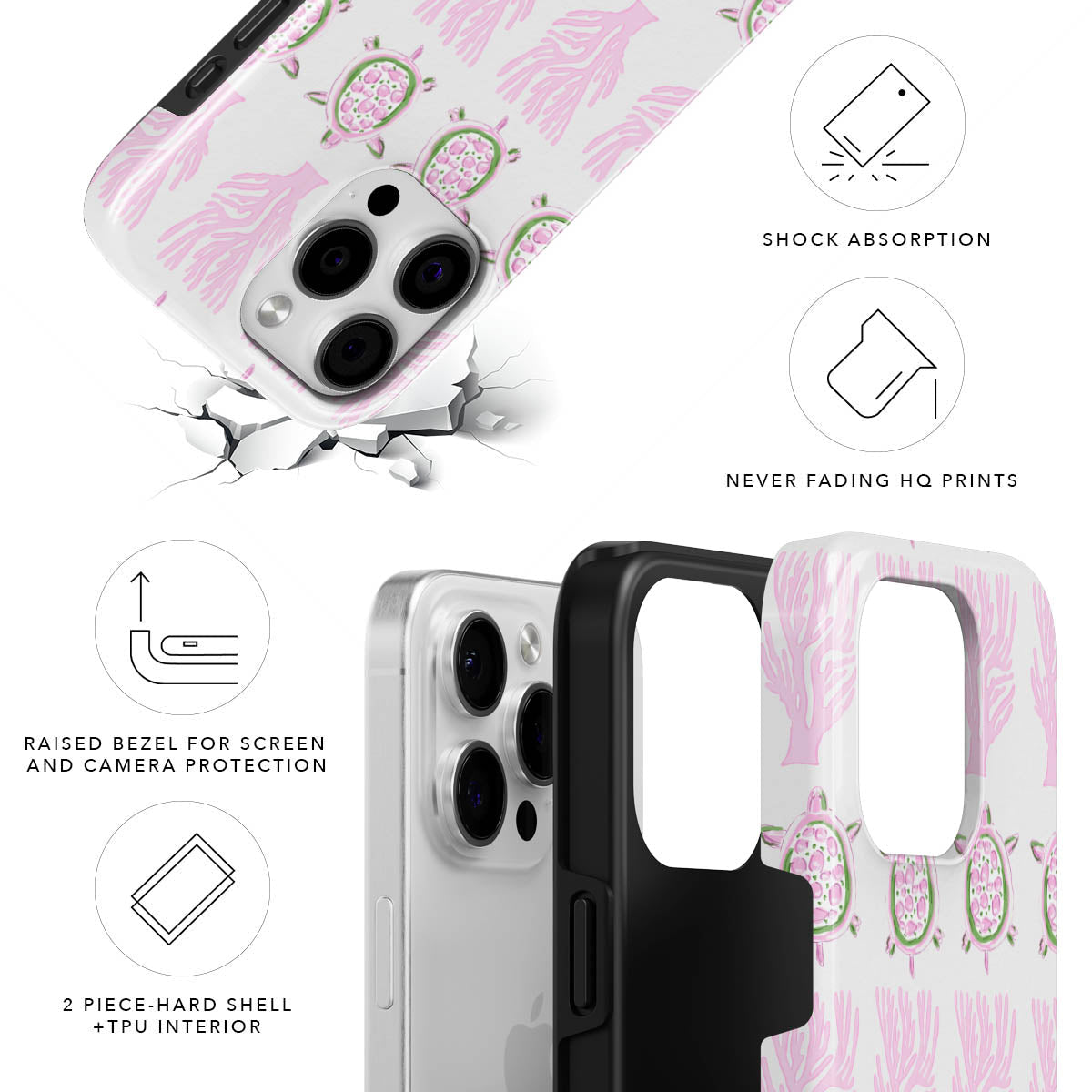 Our Tough phone cases are extremely protective, as it contains inner soft TPU layer for shock absorption and has raised bezels for screen, and camera protection.